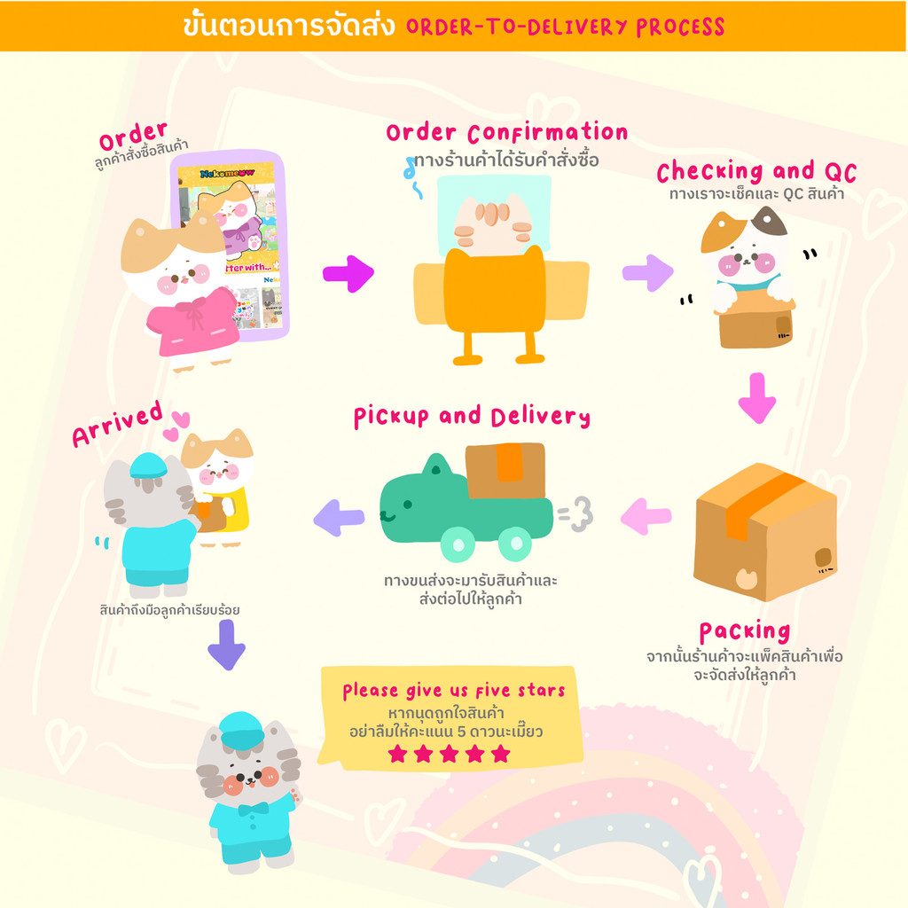 - หลังจากลูกค้าโอนเงินจะใช้เวลาในการจัดเตรียมสินค้าประมาณ 1-3 วัน และใช้ระยะเวลาจัดส่ง 2-5 วัน ขึ้นอยู่กับแต่ละบริษัทขนส่ง