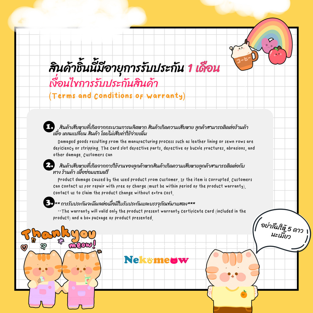 *หากสินค้าเสียหายจากการใช้งานของลูกค้าสามารถติดต่อผ่านทางร้านค้าเพื่อส่งซ่อมแซมฟรี ภายในระยะเวลารับประกันสินค้า (โดยลูกค้าจะได้รับ WARRANTY CERTIFICATE CARD)