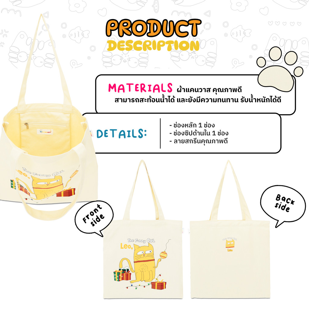 - ด้านหน้ากระเป๋า: ลายสกรีนแมวสุดน่ารัก