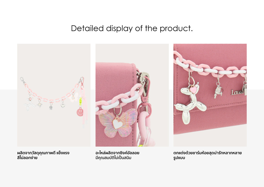 - แต่งได้ทั้งกระเป๋า สายสะพาย หรือคล้องเป็นพวงกุญแจ